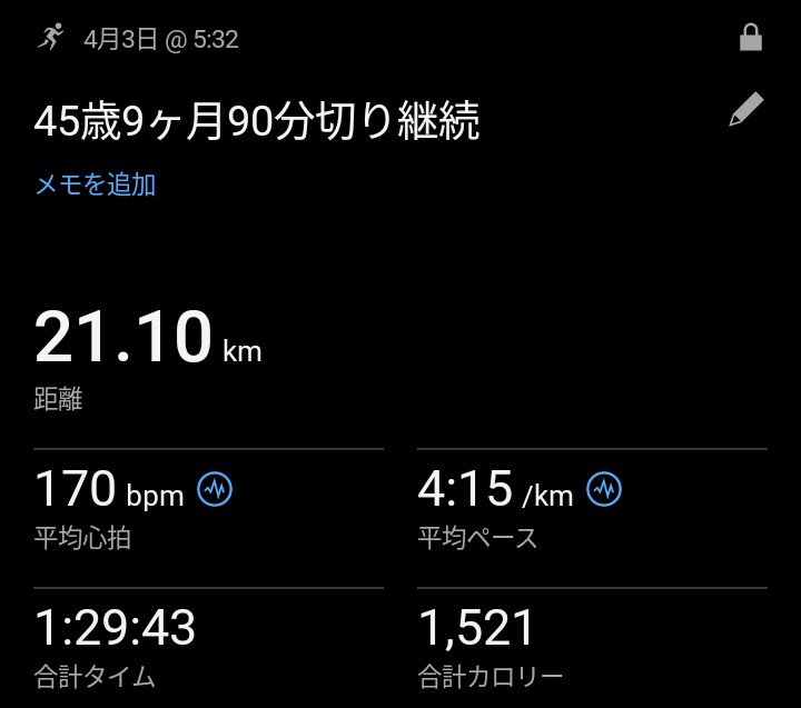 45歳ハーフ90分切り継続 公開日:2026年4月3日 ラン中富土通のランニング記録 もうすぐ46歳。そしてまもなく暑くなり、シーズンオフ。 今朝5時半過ぎ、45歳でのハーフ90分切りラストチャンスで走りました。 本当にきつかったですが、達成しました。なんとか90分切り12年継続です。 6㎞過ぎではすでに […] 続きを読む