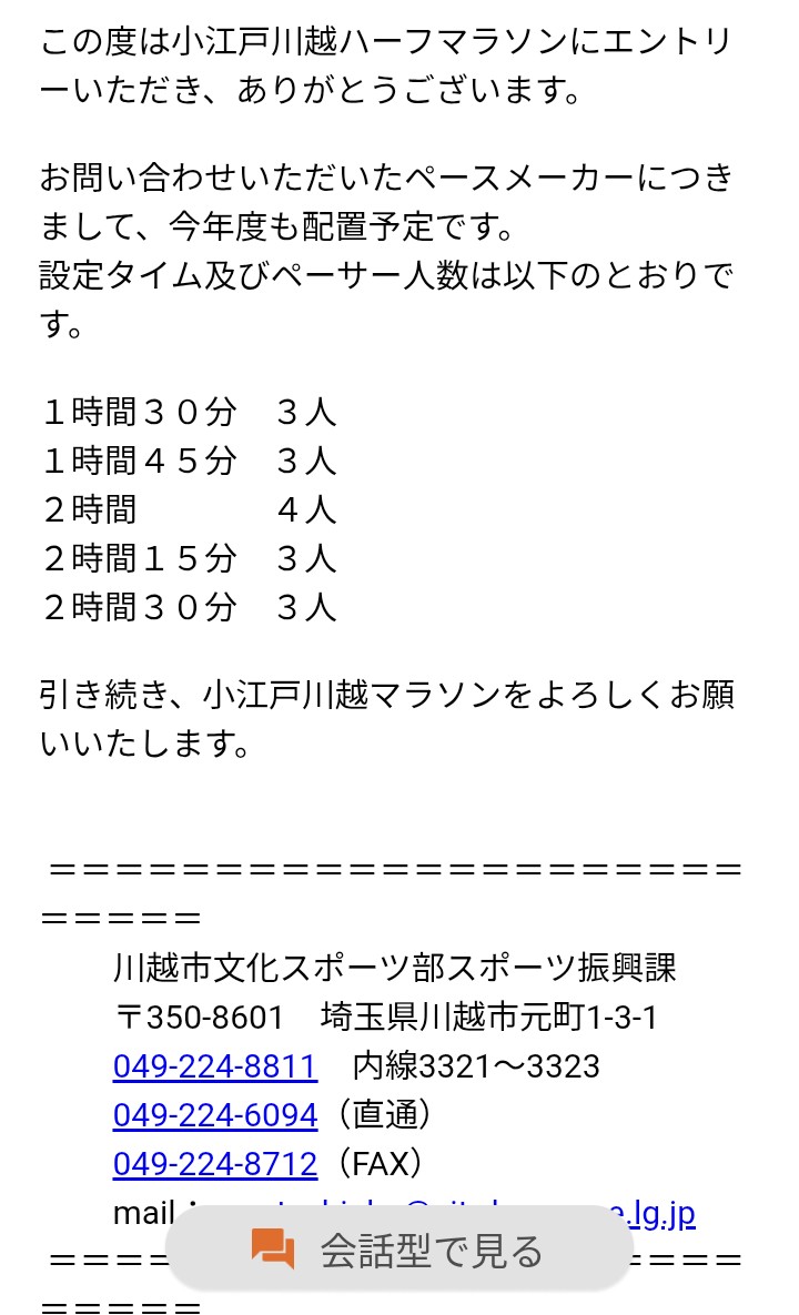 2025年小江戸川越ハーフマラソンのペースメーカーについて問い合わせ結果 公開日:2025年10月8日 ラン中富土通のランニング記録 2025年小江戸川越ハーフマラソンのペースメーカーの配置について問い合わせをしました。↑の回答を頂きました。 90分切りが目標なので、ペースメーカーについていくのが最良なのかもしれません。 今朝は15kmのペース走(4’ […] 続きを読む