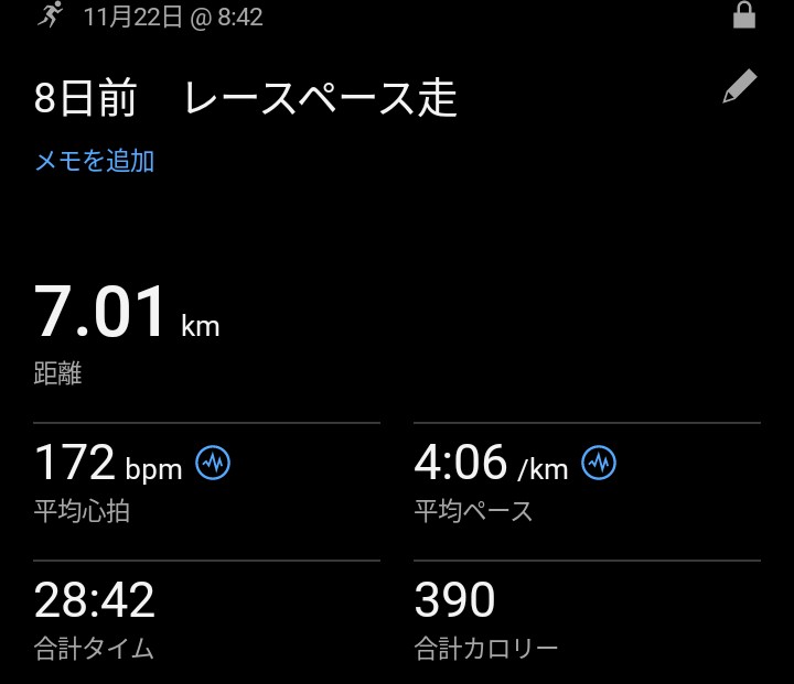 8日前 レースペース走 公開日:2025年11月22日 ラン中富土通のランニング記録 レース8日前。7kmのレースペース走をやりました。 しかしオーバーペースでした。今の走力では閾値走になってしまいました。これではせいぜい10kmまでしか持ちません。 体はしっかり動かしましたが、速く走ろうという意識はなく […] 続きを読む